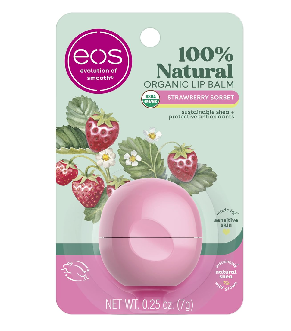 EOS 100% Natural & Organic Lip Balm in Strawberry Sorbet provides all-day moisture and care. Dermatologist recommended for sensitive skin. Smooth, nourishing lip care, 0.25 oz.