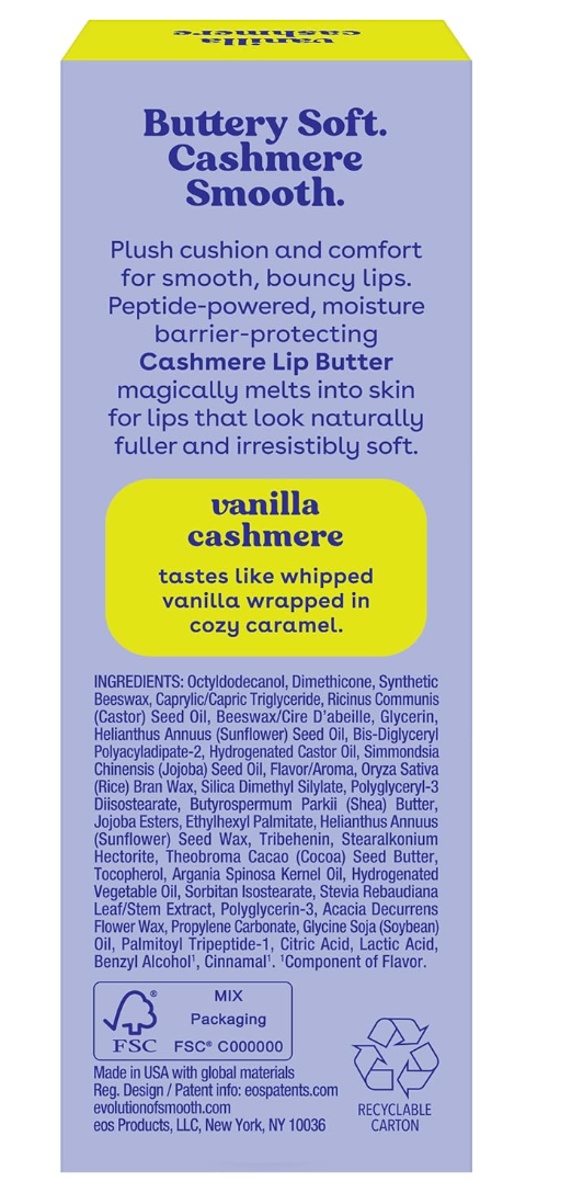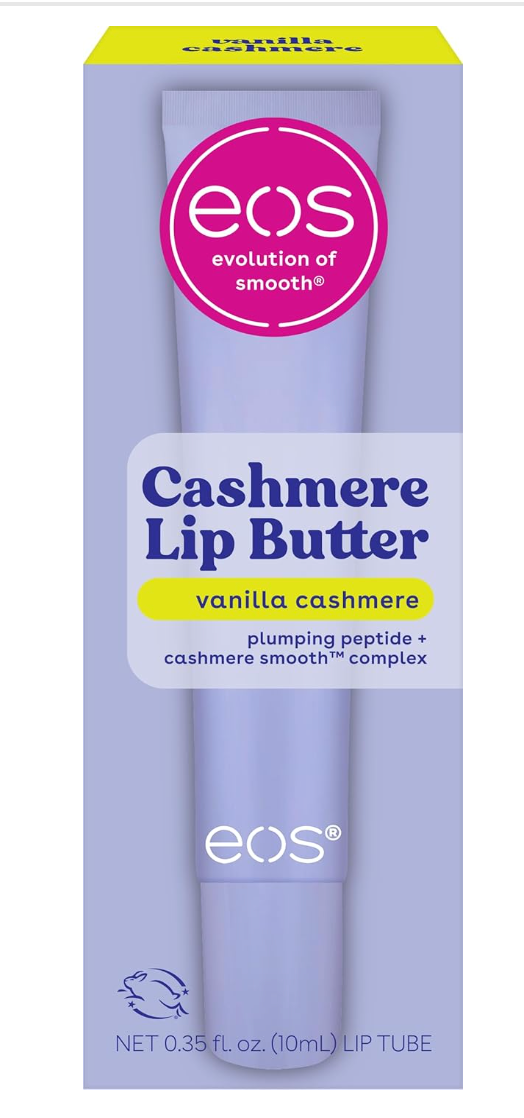 EOS Cashmere Lip Butter in Vanilla Cashmere provides deep hydration with plumping peptides for smooth, soft lips. Lightweight formula, 0.35 fl oz. Perfect for all-day moisture and lip care.