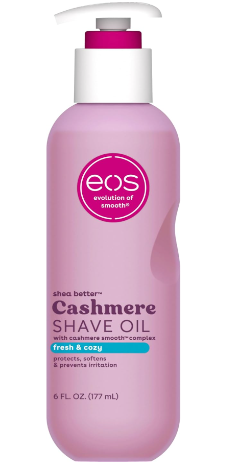Indulge your skin with eos Cashmere Shave Oil. Fresh & Cozy scent soothes and moisturizes, while preventing irritation and razor burn. Entire bikini area-approved for a smooth and comfortable shave. 6 fl oz for long-lasting use.