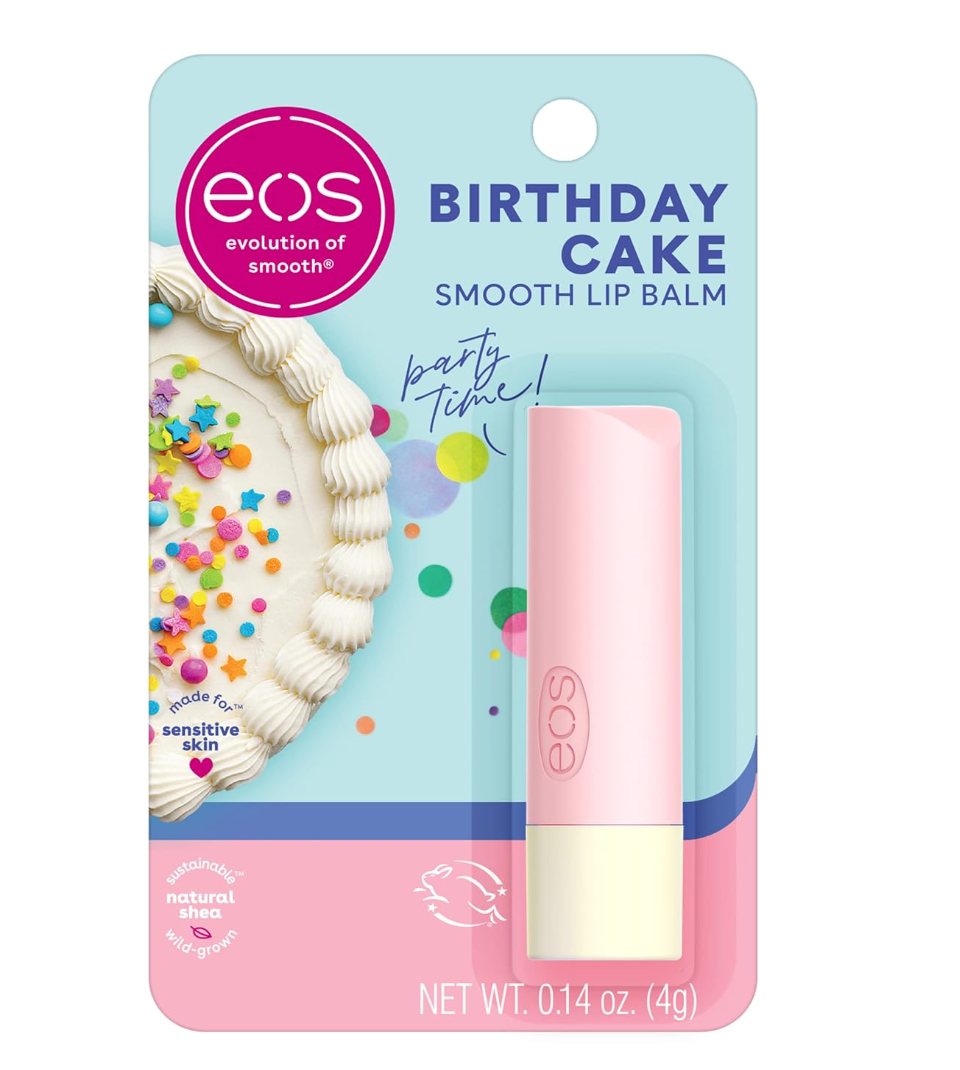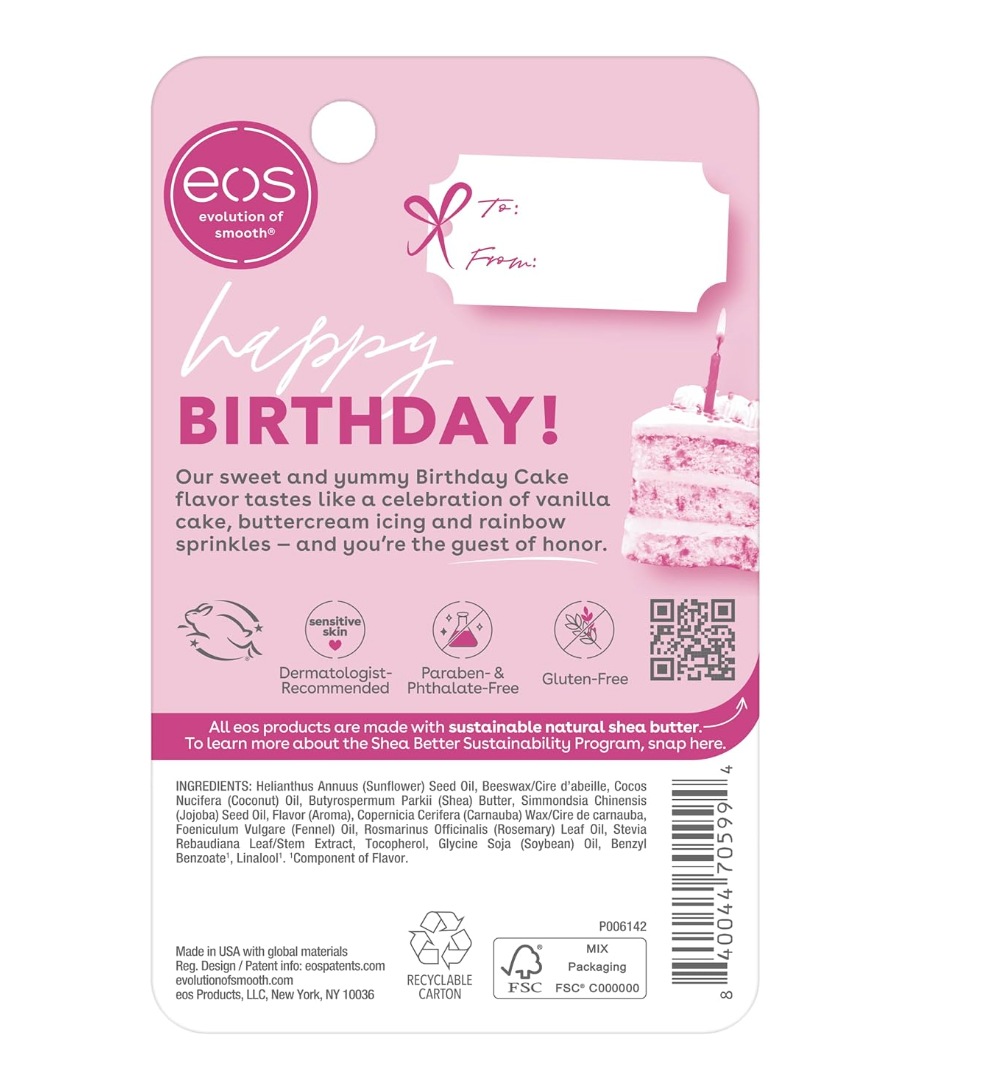 EOS Natural Shea Lip Balm in Birthday Cake provides all-day moisture and nourishment. Infused with shea butter for smooth, soft lips. Perfect for everyday care, 0.14 oz.