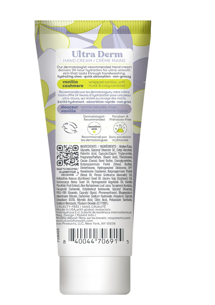 EOS Shea Better Hand Cream in Vanilla Cashmere offers instant hydration and lasting protection. Enriched with shea butter for soft, smooth hands. Ideal for daily use, 2.5 oz.