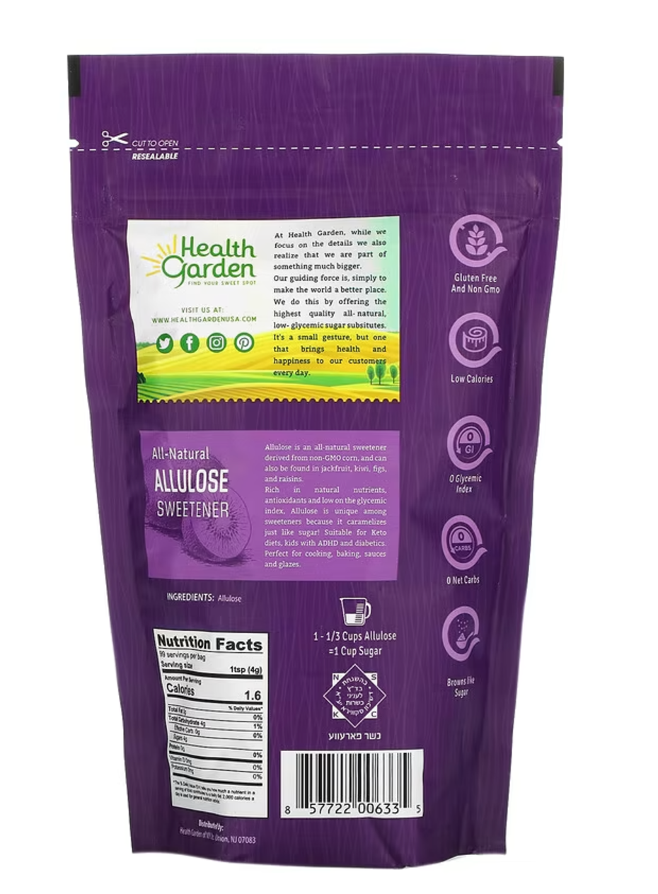 Health Garden's All-Natural Allulose Sweetener, a 14 oz (397 g) package of pure, healthy sweetness. This premium product is perfect for those looking for a natural alternative to sugar, without sacrificing taste. Enjoy the benefits of allulose in your baking and cooking, Gluten-free.