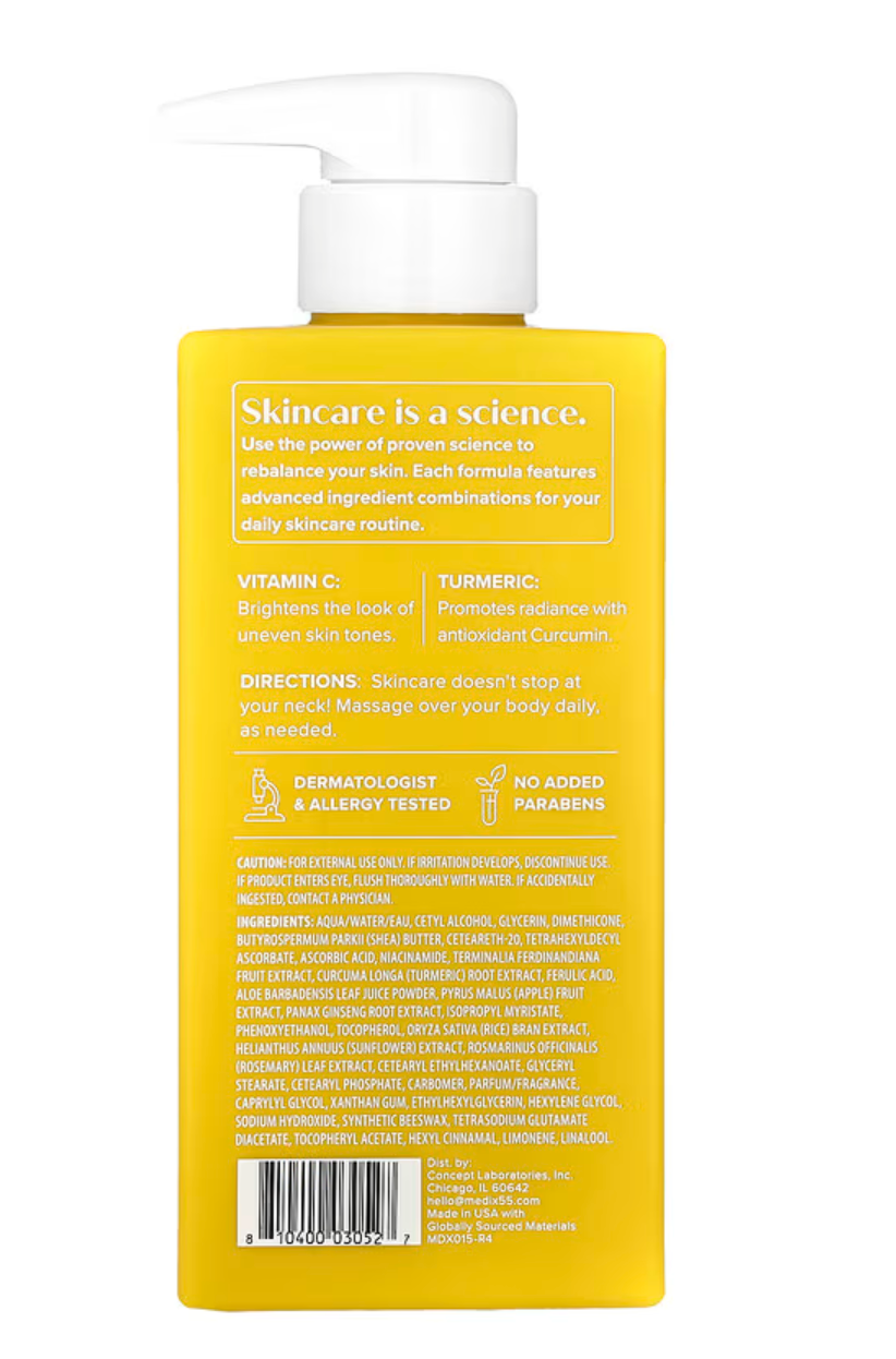 Indulge in luxury with Medix 5.5 Body Cream. Infused with Vitamin C and Turmeric, this 15 fl oz cream deeply nourishes and protects your skin, leaving it with a radiant glow. Treat yourself to a spa-like experience and achieve healthy, vibrant skin.