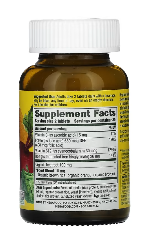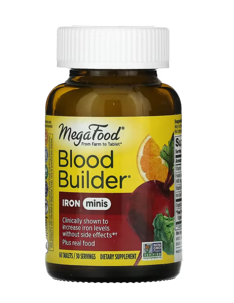 MegaFood Blood Builder Minis are clinically shown to increase iron levels without nausea or constipation*. Take two of these convenient mini tablets a day. We add real food like organic beets and oranges, with key nutrients like folate, iron and B12, that help to improve energy levels and combat fatigue. Vitamin C is included to support iron absorption.