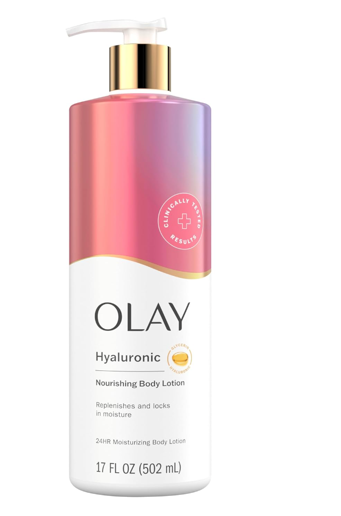 Olay Nourishing Body Lotion with Hyaluronic Acid & Vitamin B3 Complex delivers 24-hour hydration for soft, smooth skin. Suitable for all skin types. Fast-absorbing 502ml bottle.